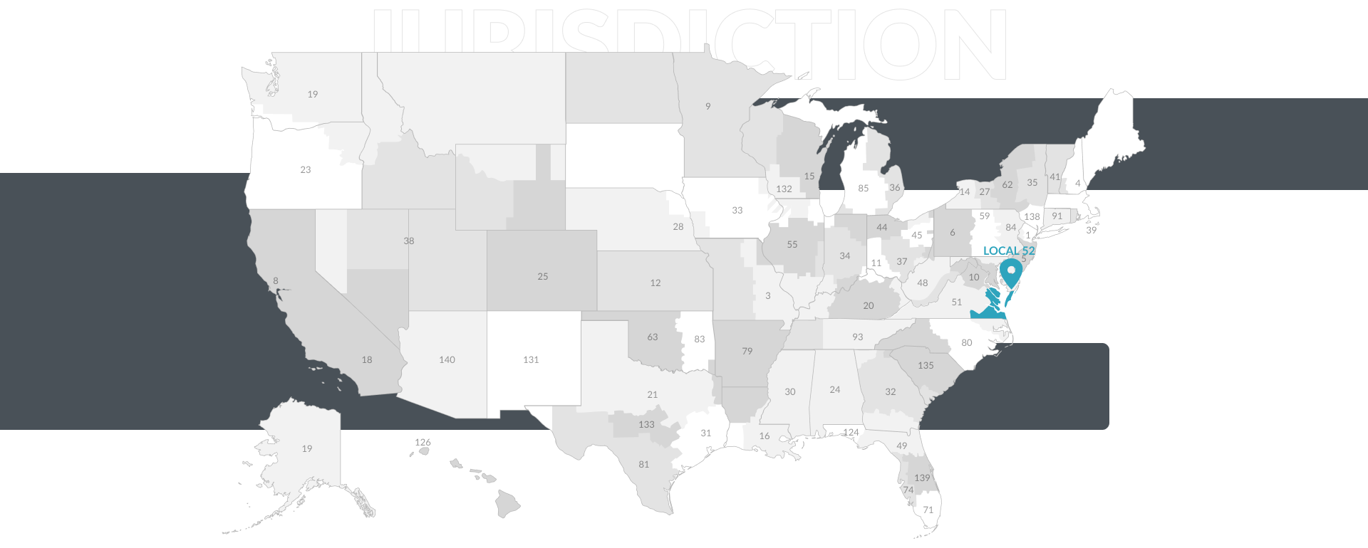 The map above shows the United States of America, with IUEC Local 52’s jurisdiction, headquartered in Norfolk, Virginia, highlighted in teal. The Local’s jurisdiction includes 19 Virginia counties and a further 9 counties in North Carolina.